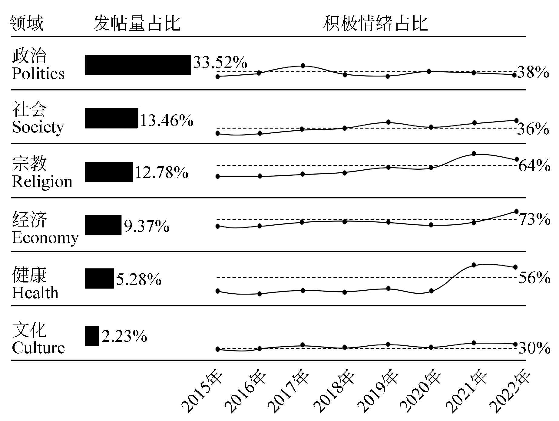 关于全人类共同价值的帖文领域分布与情感趋势